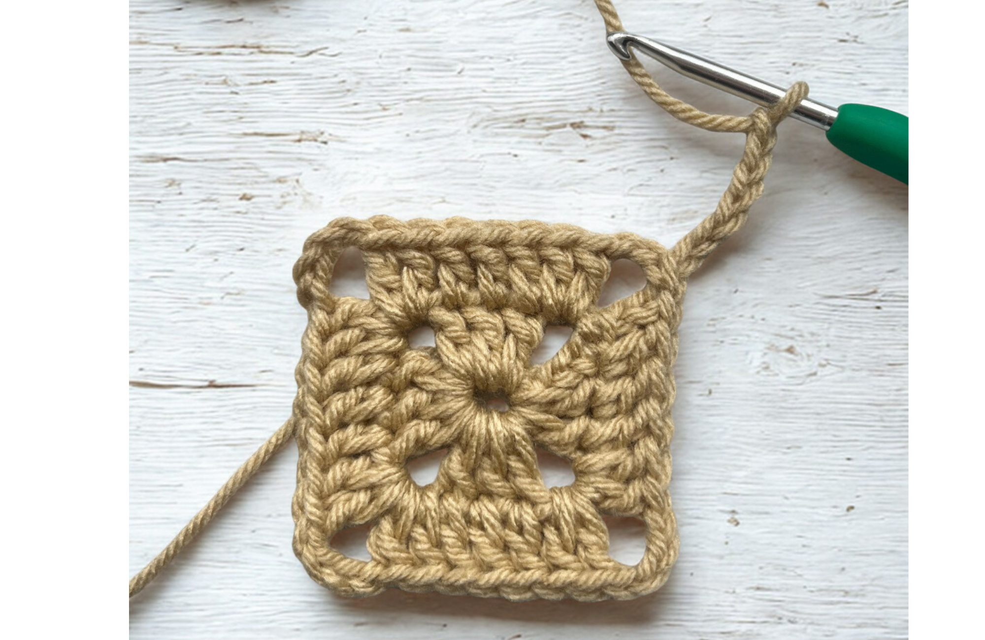 This square is worked in rounds, with the stitch count increasing evenly in each round to maintain its shape. The increases are grouped at the four corners, forming defined corner spaces that help the square lie flat and grow evenly.